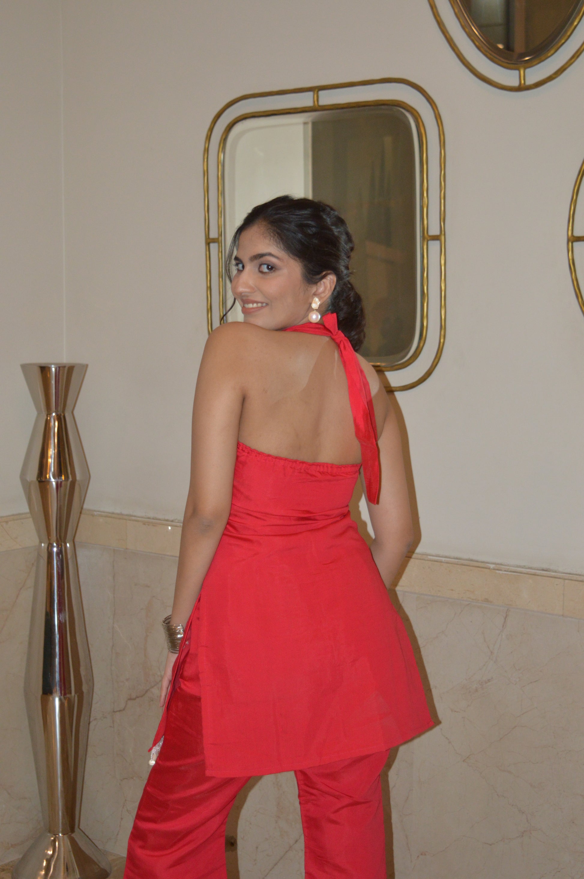 Crafted in a rich scarlet hue, this two-piece set balances structure with fluidity. The top features a striking backless silhouette that adds a sensual edge, while the front remains clean and refined. Paired with matching straight-fit bottoms, Scarlet Shine creates a look that feels powerful yet poised.